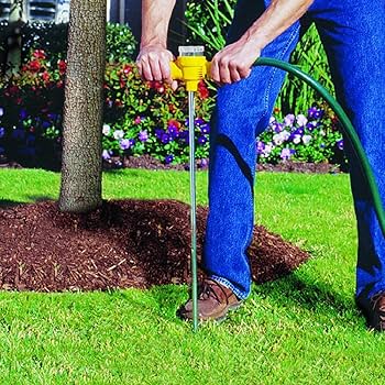 The old time method of feeding the roots is to get the area around the tree damp then with root feeder and pound the metal tube into the ground making about 4-6 holes around the mulch line a good distance away for the tree trunk and main roots.