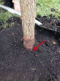 Problem #1 : The tree is planted too deeply. Sometimes the tree looks like it’s planted high enough. Keep in mind that the soil around and under the tree will compress with time and sink the root ball more deeply.