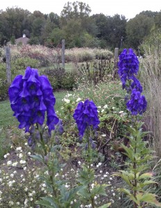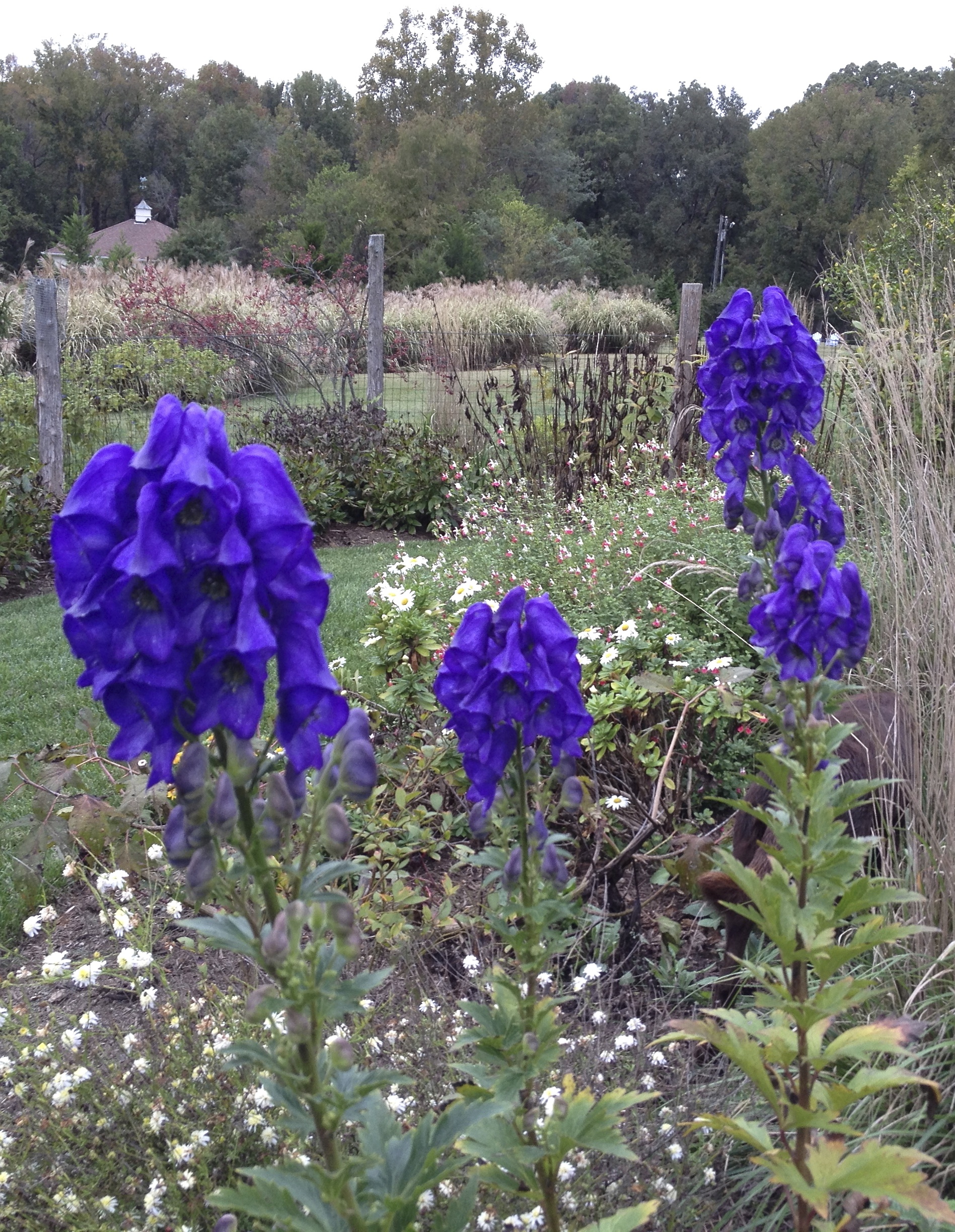 Aconitum is a bright blue perennial that stands up on its own for great late fall color.  It is highly poisonous but otherwise has no down side. My dogs stay away from it – but it is not so good if you have a leaf-eating youngster or pet.