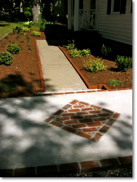 Her budget was tight, so after a lot of discussion and visiting the site in a heavy rain, my crew and I decided to create a landing on level with the driveway.  The diamond shaped brick medallion was a nice touch, I thought.
