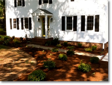 After all this, we edged the original cement walkway with bricks to hold the mulch, tie in the brick accent of the landing, and make the sidewalk look wider.