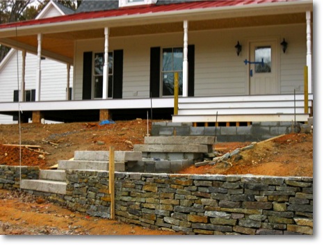 In the front, grading left us with a very steep hill to the front porch. We created a dry lay walkway in stone dust on this steep hill to promote a farmhouse look. We had to lay a block base at each landing and fill it with crusher run to support the base of the walkway. Erosion and heavy rains would dissolve the structure otherwise. These 5 feet wide, 7-inch high stone steps took 4 strong men to move, especially after the hurricane where the mud became a slip and slide. The Van Tassel stone stacked wall at the base of the stairs is a stunning first feature that you see as you enter the property from a hilly, winding driveway.