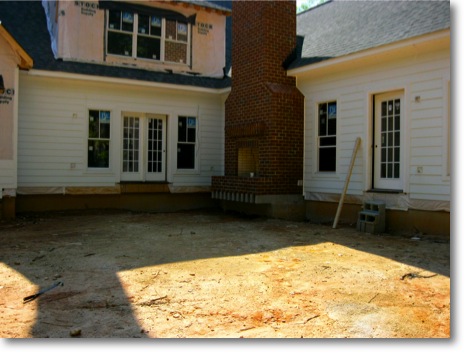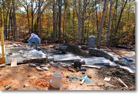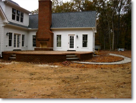 Here is a “Before and After Picture” of a raised brick paver terrace we designed and built in the back of the house. Lots of layering and tamping of crusher run gravel goes into the cinder block base of the brick faced terrace to match the grade of the fireplace. The pavers here are a 6-pattern design. The steps are bluestone treads which add another dimension into the color scape.