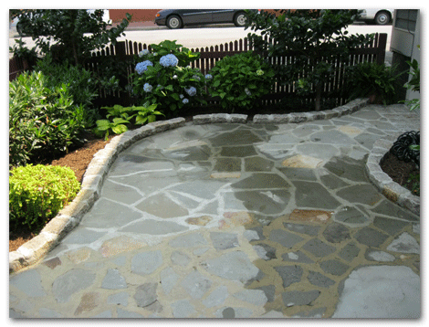 We had to match the existing aged mortar and bluestone so it looked authentic. We mixed red and white sand, yellow and tan mortar and added a touch a black paint.  We lay all the stone first, so we could do all the mortar work with one batch of color.  We worked in a few random pieces of yellow stone to the bluestone to mimic the original terrace.