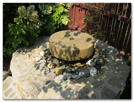 The layers of the hidden mechanisms in the fountain to make it look like it had been there long before the house was built were the basin, pump, concrete pillar,  rebar, steel mesh, river rock, millstone and water! We had to get the millstone itself really level by using dimes and nickels under the edge of the millstone.  Water splashes quietly and evenly over the edge.