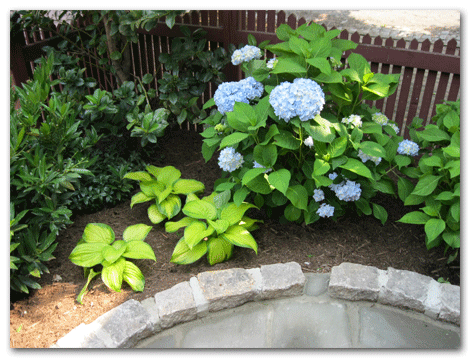 The hydrangeas you see here are a lovely new variety called All Summer Beauty! We added to the drama of the green and blue with the chartreuse colored Stained Glass hosta.  A trumpet coral vine was planted along the hot side of the fence to climb up in a single column and then drool along the top of the fence. We may add narrow hornbeam trees on an unplanted fence for height and privacy this fall.