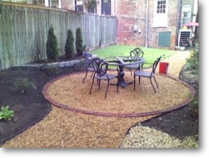 In the back, we made allowances for a future screened in porch. Between that and the wear and tear her 3 dogs have on the yard, we put in zoysia grass where the porch will and a Sherando buff gravel walkway edged in steel with a brick circle accent, a small bluestone retaining and replanted her inventory of plants.
