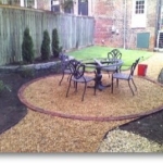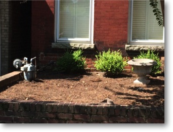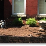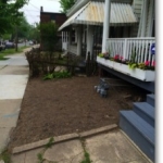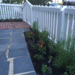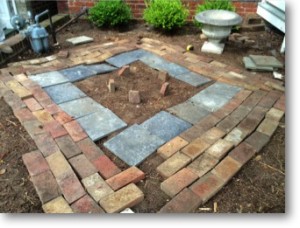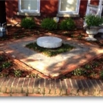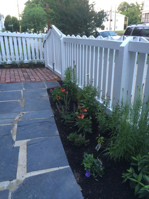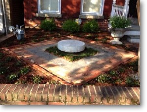 Our second garden has a lovely view of St John’s church from the front porch. Again, there was nothing but dirt and mulch. In the front, we dug below a foot of mulch to find old brick. We used that brick and the client’s slate. The guys and I played with how much inventory we had to make a geometric shape under a millstone we had lying around.