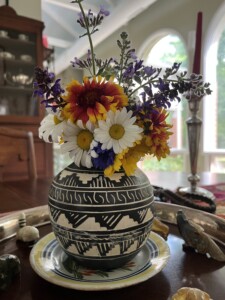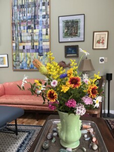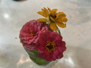 For those of you who say, “ I’m no good at doing that”,  I’m right there with you. My usual approach to cutting flowers is the last photo of 3 zinnias. I know how to grow flowers but never changed my perspective to ‘see’ them in a bouquet.  For a few of the flowers, I  had to ask where they were on my property!