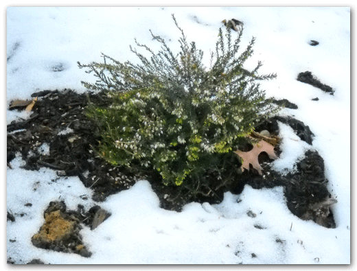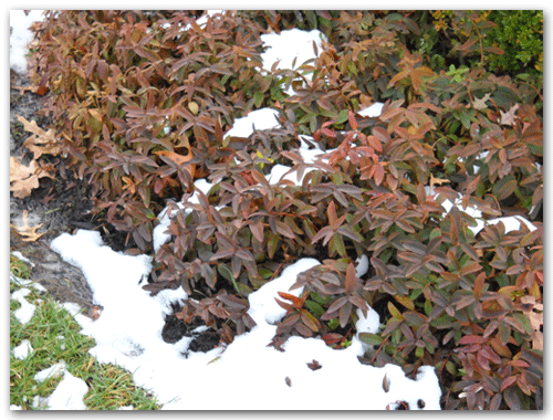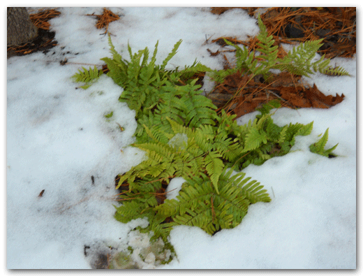 Autumn Fern– If had had one perennial to bring to another planet, it would be this one. This picture shows it bent under the weight of the snow. It perked up after the snow melt and retains its green foliage. In the spring we will cut it back to the ground. The new foliage will come up a burnish red then turn to green.