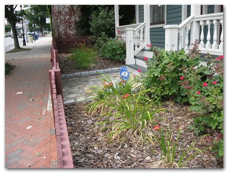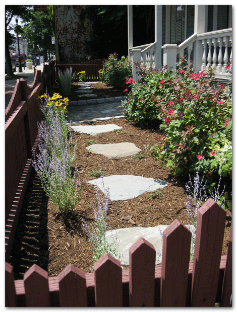 We were asked to continue with the front yard of last month’s Church Hill garden by planting flowers within a picket fence.  The design gave the space a lovely English garden look with flowers in the front.  Their existing knock out roses stayed, but we added Russian sage, a “Sonora” rudebekia, and two “Pinky Winky” hydrangeas to give the garden color lasting into the late fall. Powerful tumbled blue stepping stones add weight and power to the small space.