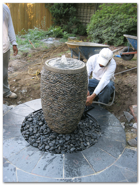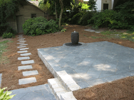 This Westover Hills terrace was designed by Christie and the client with a diamond shaped pattern in black slate.  The fountain is set off by the circular slate base. It is its own entity- half on and off the terrace, half in and out of the lawn.  We will show more pictures next month of the entire job.