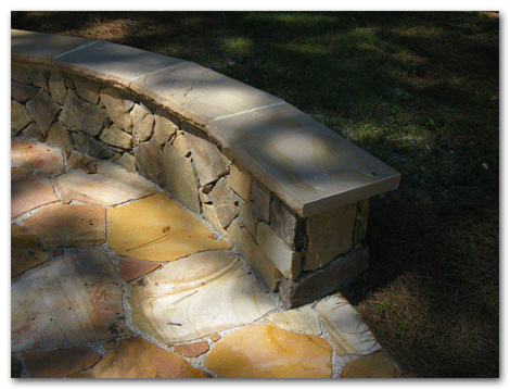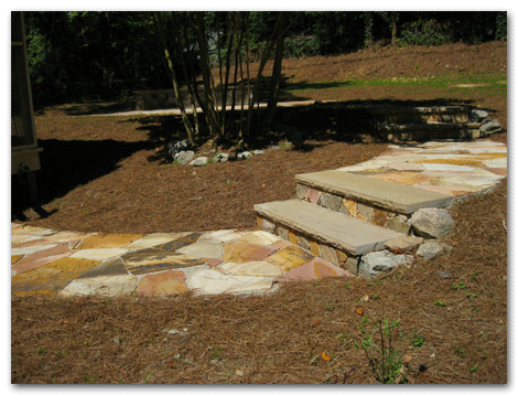 This client chose 3 types of stone to blend into her new dry lay terrace, seat wall and sweeping stairway. The air of mystery is added by the existence of the multi trunked crape myrtle.  Little did we know before we began clearing the lot that the neglected tree would become such a key element in the design?