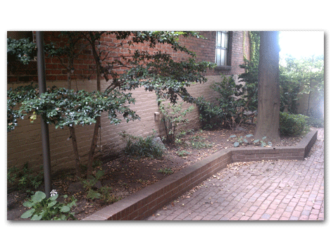 We placed a “muy grande” boulder in front of the building for instant identification of the space.  The plantings include a purple flowered vitax which hates to be watered and a few sedums planted close to the rock.