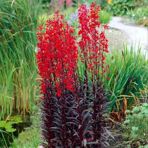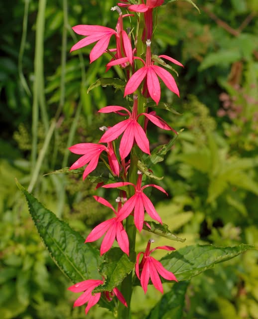 Lobelia is also called the Cardinal flower. This is not to be confused with many annuals also named lobelia. It is striking red or blue and now has been hybridized with a pink, purple and white color. It likes damp conditions and shade.