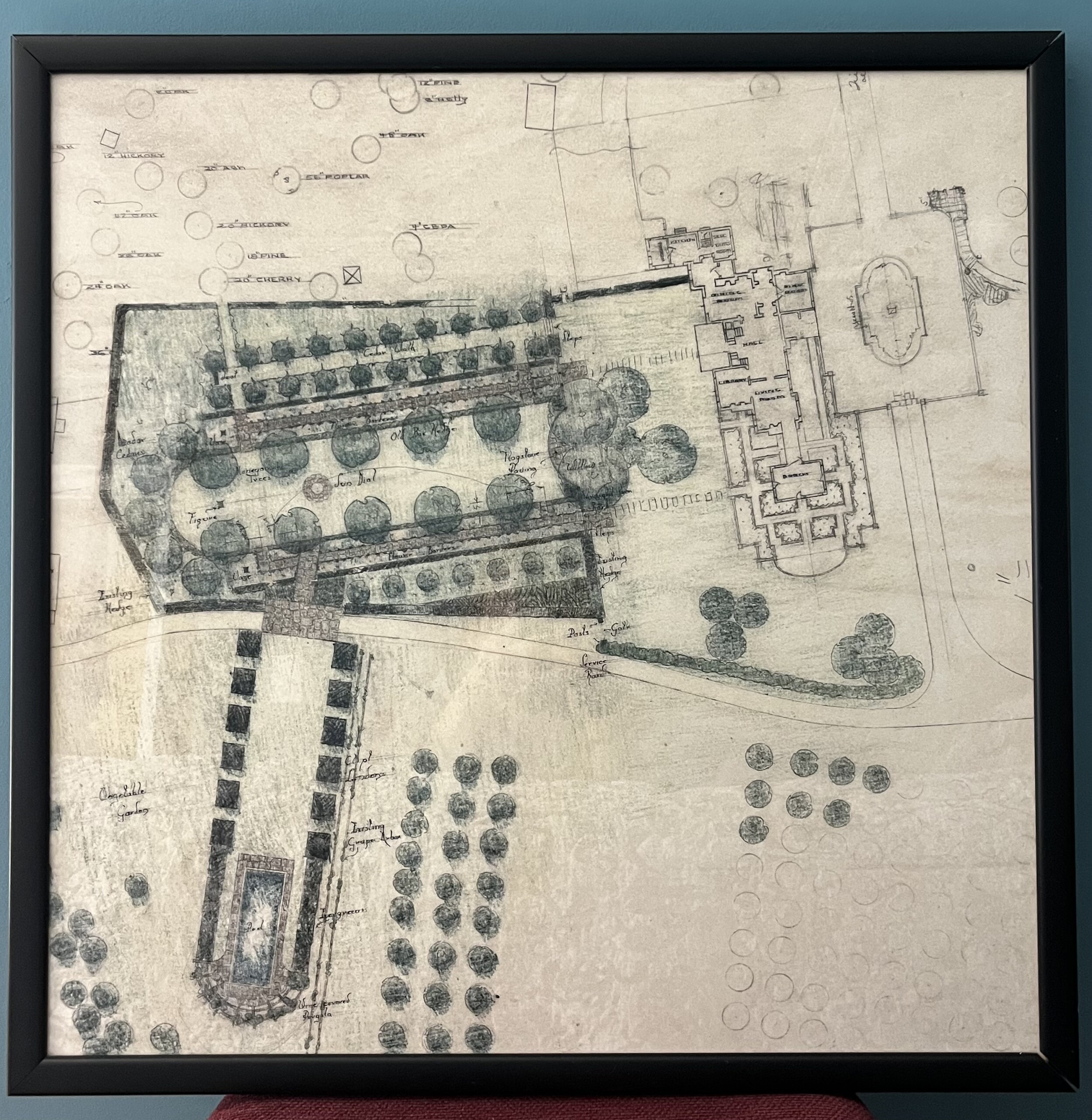 Below is the Gillette plan I had scanned and then bought from the Virginia State Library for the Stony Point Garden when it was a residential house. The top most area in the plan has 5 locust trees on either side of a center area creating a lovely allee with lawn as the interior.