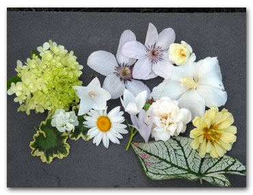 When I first heard the term “white garden”, I wondered how you would ever develop a garden with white blooms and variety. As I dealt with more and more plants over time, I saw first hand that the palette is huge for whites. Lime green, blush pink, ivory, creamy yellow, white with pink streaks, white with purple blotches-all these colors count as white. Flower shapes include great variety with the daisy, trumpet, orchid, bell shapes and flower cluster.