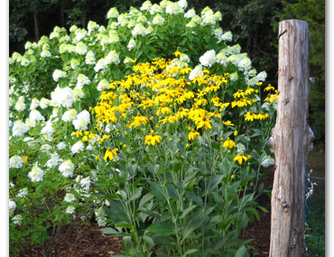 We use white as a dramatic foil for other colors. A yellow is much more intense (see picture) when backed up with white. Even if you don’t have a totally white garden, you can plant pure white next to a bright purple, for instance, to make the second even more striking. Take a look at these whites.